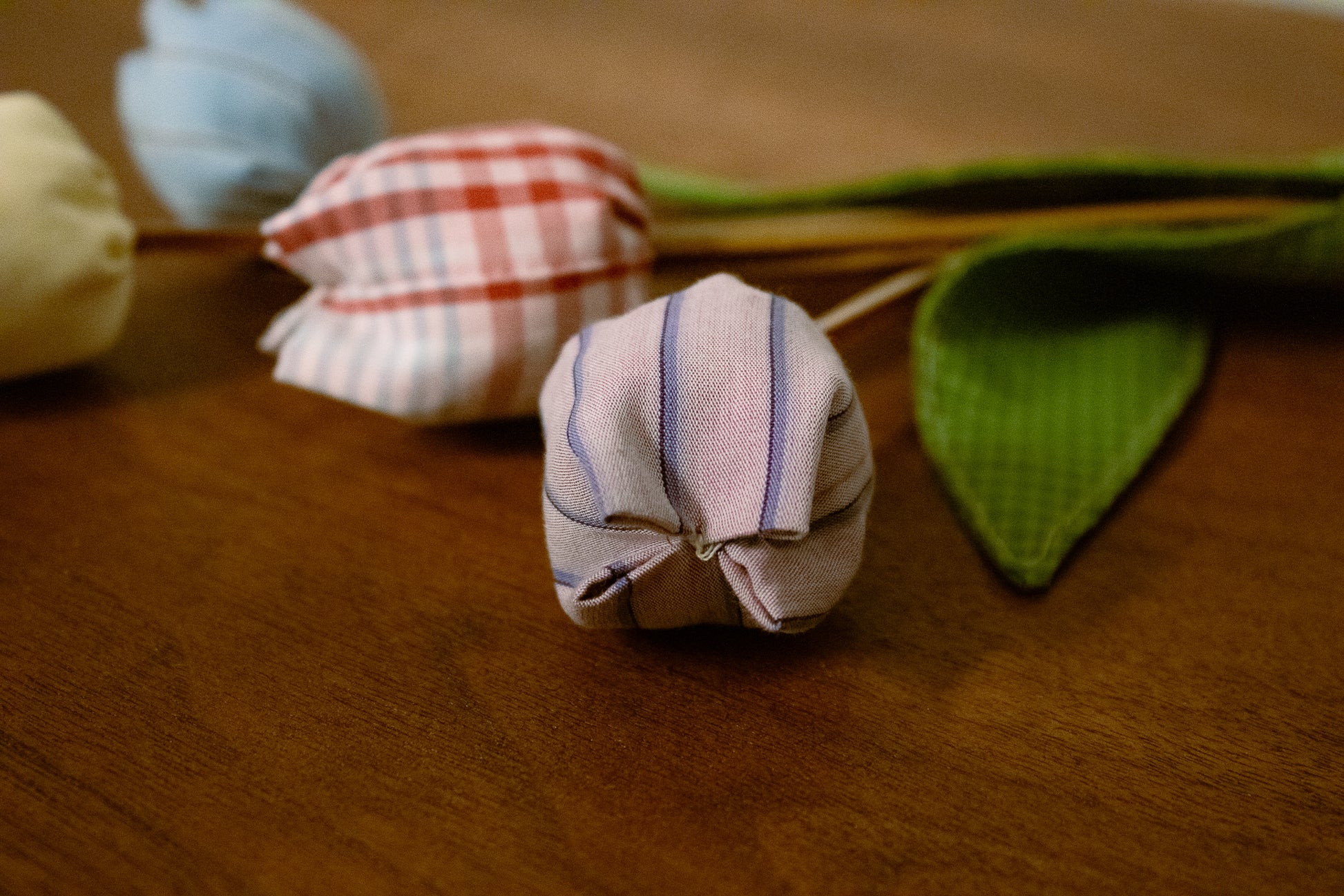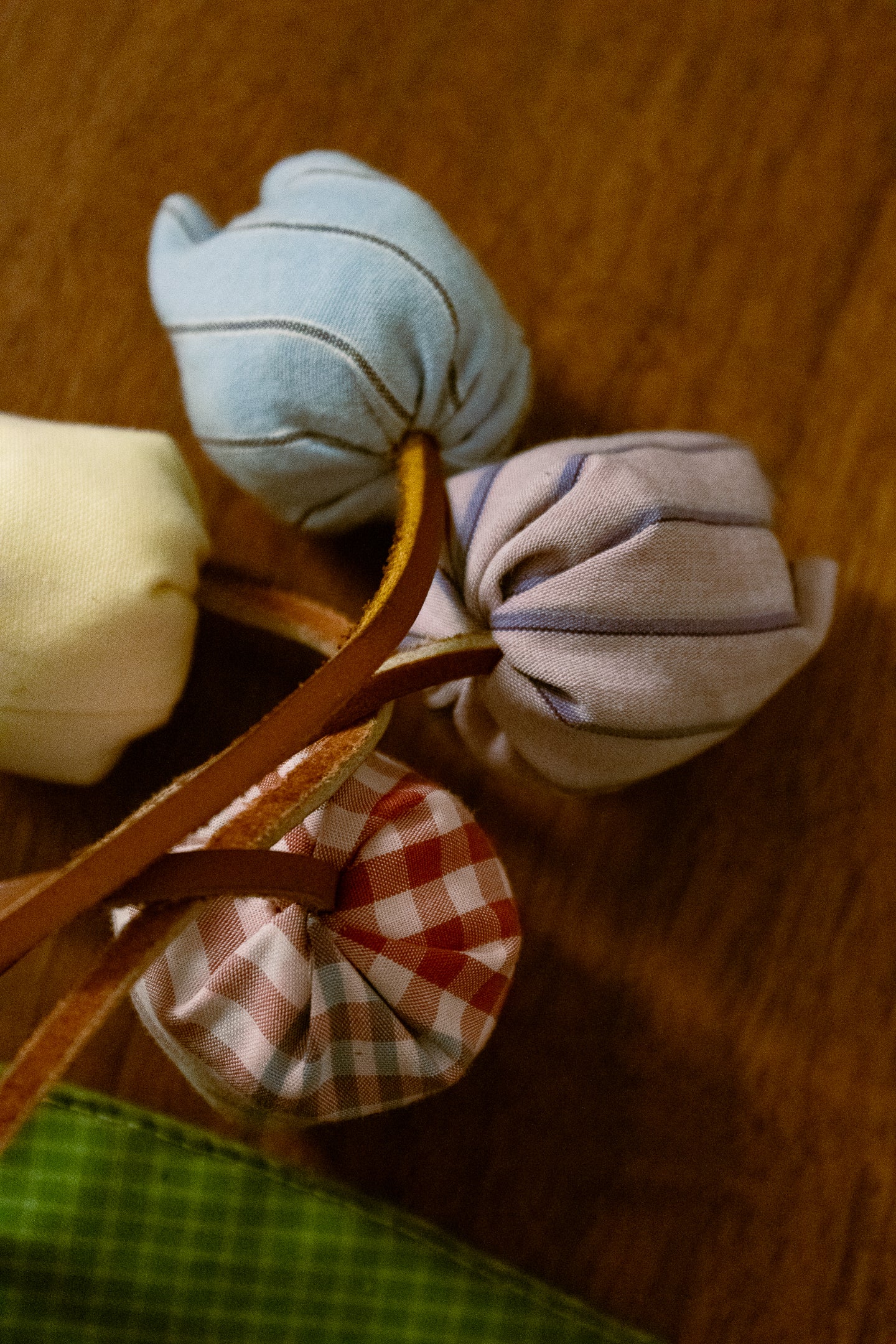 Give your bag or keys a pop of sustainable charm with this bunch of four handmade tulips. Each bloom is crafted from reclaimed shirt fabric, with petals stuffed using off-cuts from our bag-making process and leaves sewn from the same rescued material. The tulips are secured to a leather cord, finished with a keychain clip and keyring so you can attach them wherever you like.